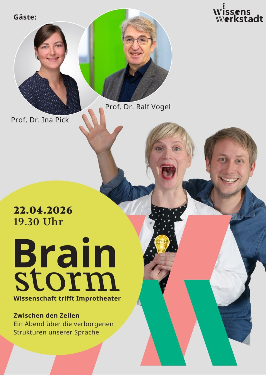 In dem erfolgreichen Format der Bielefelder Wissenswerkstadt „Brainstrom“ geben zwei Forschende der Universität Bielefeld Einblicke in ihre Arbeit und liefern zugleich Stoff für spontane Szenen, Songs und Gedichte. Sie werden von den moderierenden Impro-Profis Nele Kießling und Marvin Meinold („Die Stereotypen“) dargeboten und vom Musiker Jannis Kaffka begleitet.