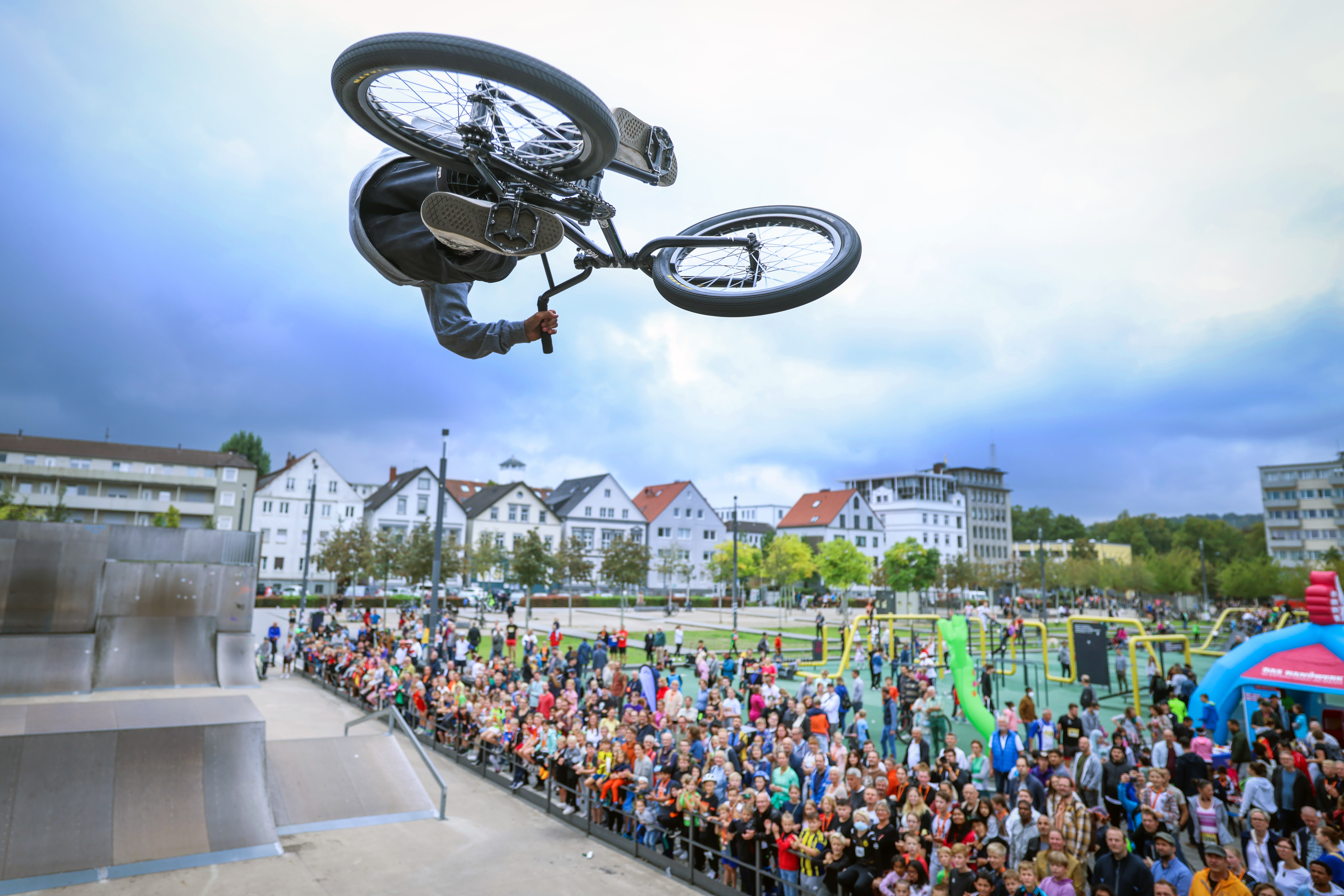 Für Zuschauer am Wegesrand organisiert Bielefeld Marketing ein abwechslungsreiches Rahmenprogramm für die ganze Familie. Profi-Sportler Benjamin Kopp liefert mit seinem Showteam „Right On“ spektakuläre Actionsport-Shows mit BMX-Rädern auf den Rampen am Kesselbrink. Außerdem lädt das Bobby-Car-Solar-Showrennen (15 Uhr) zum Mitmachen ein. Die Marching-Band „Blaanke Bössels“ aus Holland sorgt mit Tuba und Posaune für Gute-Laune-Musik.